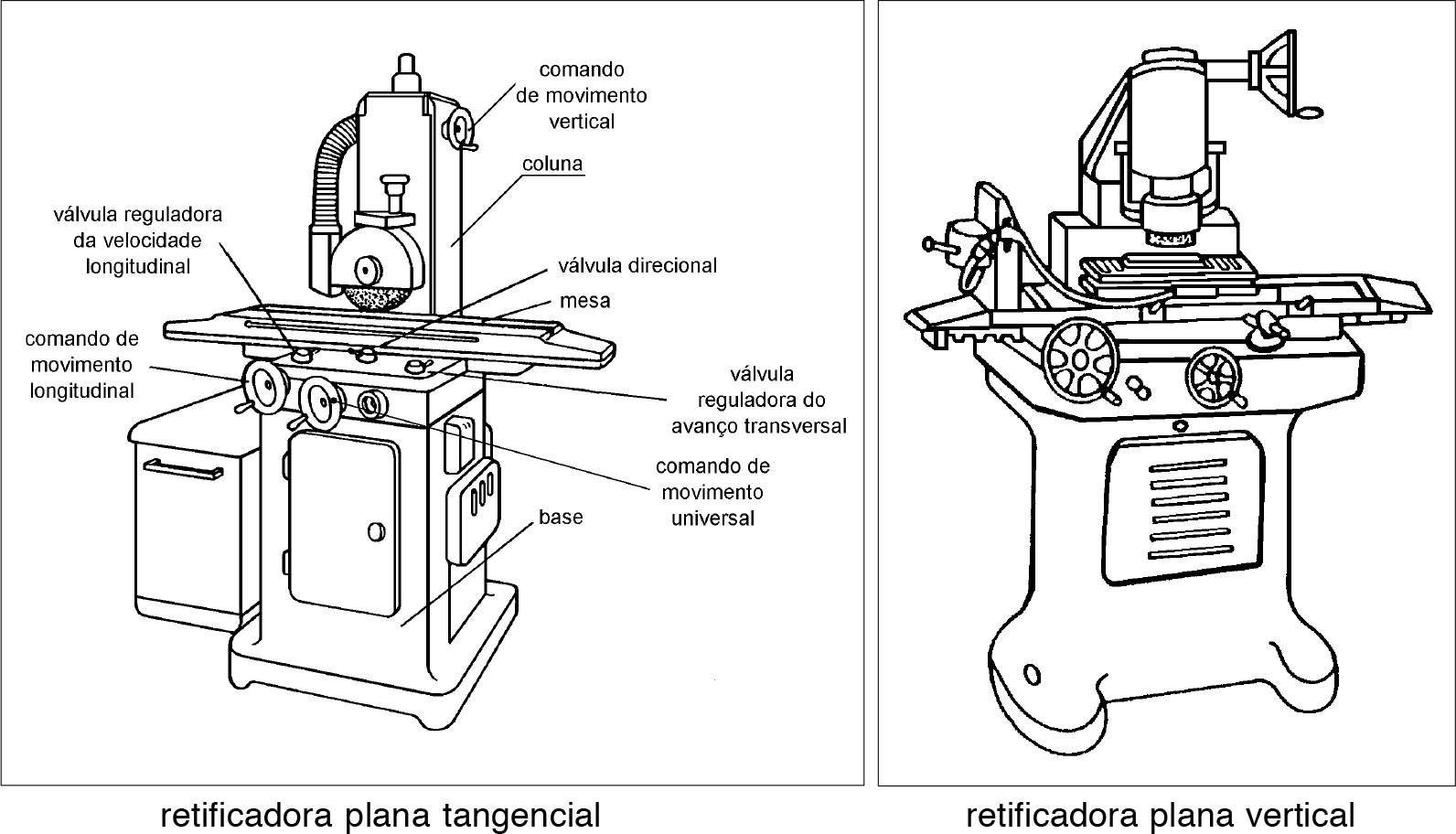 Esse tipo de máquina retifica todos os tipos de superfícies planas: paralelas, perpendiculares ou inclinadas.
